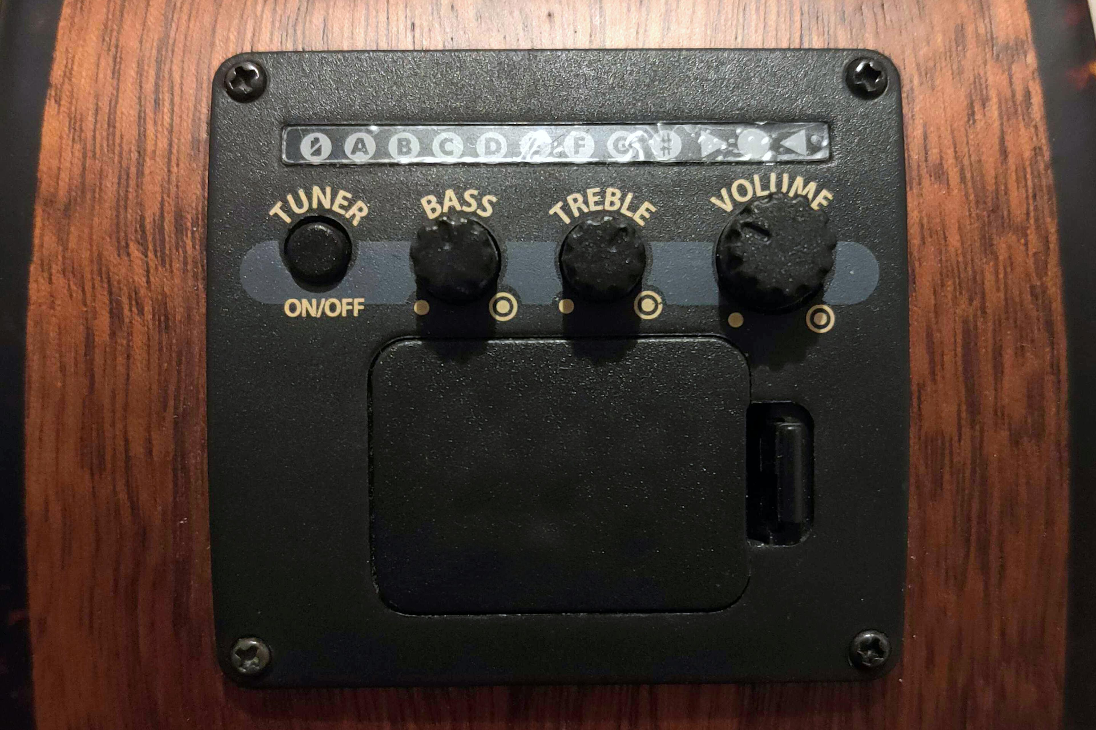 It is worth noting that the sound hole mounted pickups function in the same way as a typical electric guitar pickup sensing changes to the magnetic field as the strings vibrate. As a result they will lose the majority of an acoustic guitar's character. Piezo style pickups sense vibrations from the strings through the saddle and bridge to the soundboard and so retain the acoustic qualities. Most models will also include a small preamp due to the weak pickup signal and so require a battery too. These are commonly found in the side of the guitar along with an EQ to tweak the tone and an electronic tuner. The jack socket to plug in the cable is normally mounted on the bottom edge.